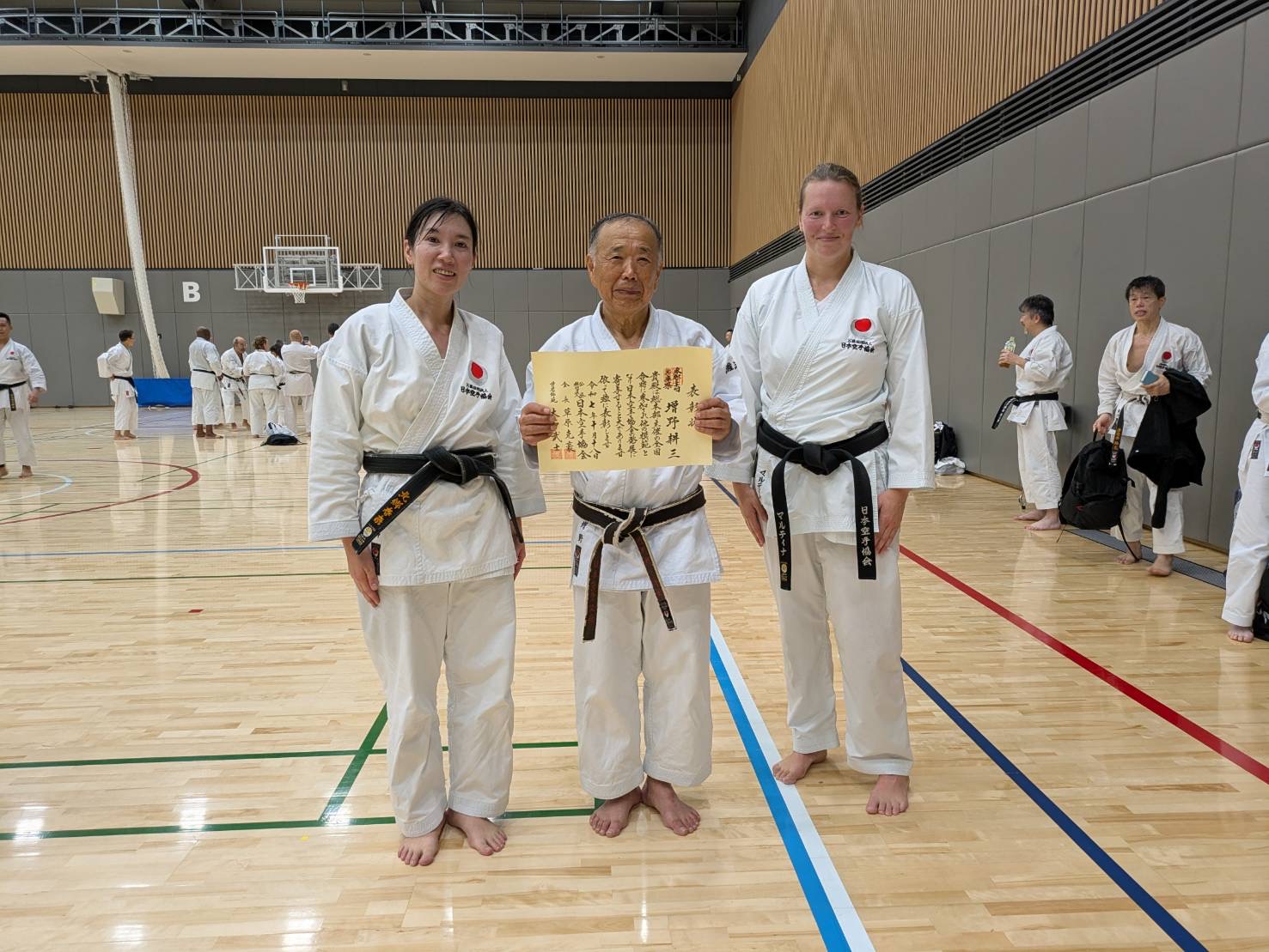 左の北郷指導員も今回、三段を取得しました。 中央の増野指導員は全国合宿30回参加の表彰を受けました。